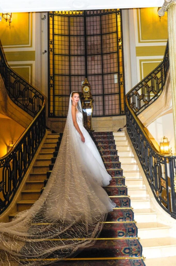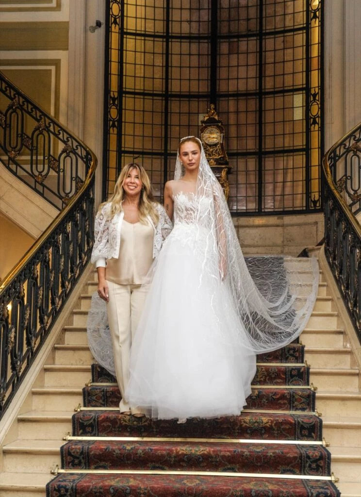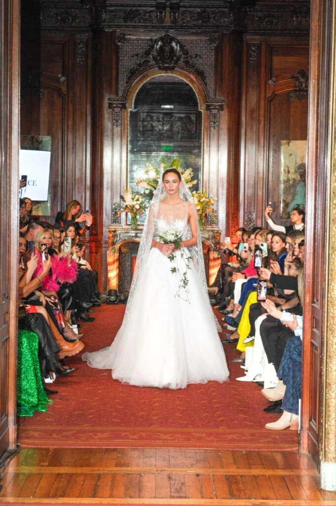 Su segundo look fue el elegido para cerrar esta romántica y glamorosa pasarela que contó con la presencia de de su mamá en primera fila. La joven lució un sofisticado vestido nupcial en tul bordado y amplia falda que presentaba un largo velo al tono.