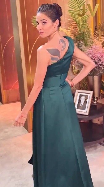 En esta oportunidad, Juana lució un vestido en crepé en color verde esmeralda, con un solo hombro y un tajo lateral. Se trató de un diseño de Gabriel Lage que fue complementado con unas sandalias negras con detalles de brillos. La pieza se destacó por su drapeado arquitectónico sobre el busto, una silueta fluida y un sensual tajo lateral que aportó movimiento y un toque audaz.
