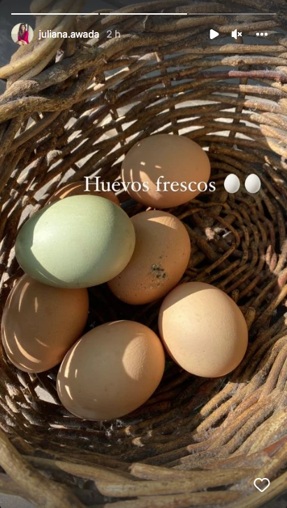 Para protegerse del sol, Pomi usó sus ya clásicos antejos. "Buen día, hoy tengo ayuda. Mamá", escribió Juliana en su posteo, donde además sumó fotos de sus gallinas y de los huevos que pudo recolectar para preparar el almuerzo del domingo.