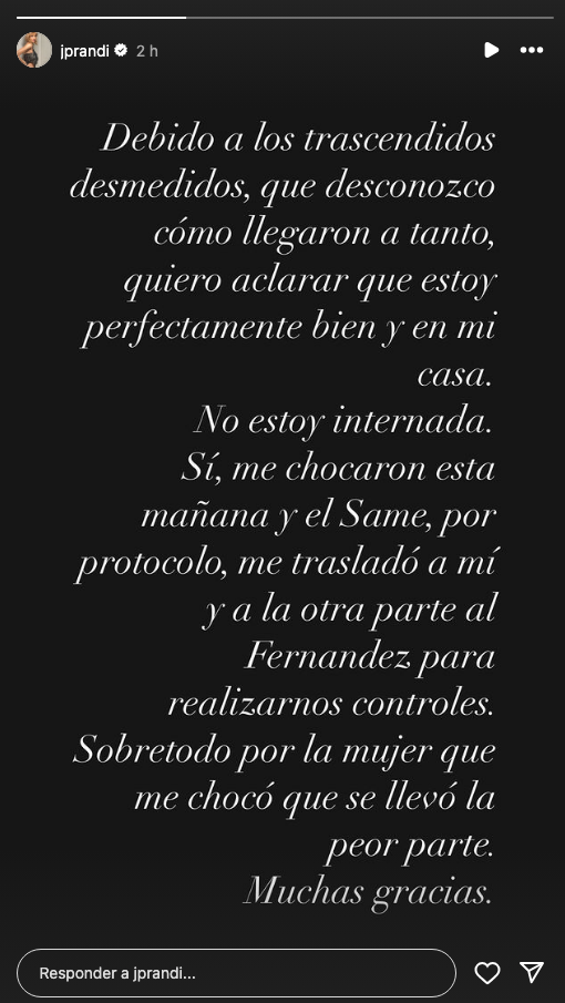 Julieta Prandi usó sus redes sociales para romper el silencio tras el accidente vial que protagonizó este viernes, cuando sufrió un choque en cadena y tuvo que ser trasladada al Hospital Fernández de esta Capital.