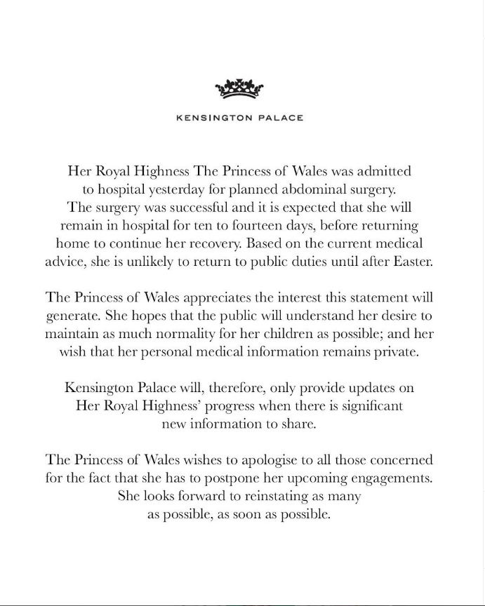 "Su Alteza Real la Princesa de Gales fue admitida ayer en el hospital para una cirugía abdominal planificada”, así comenzaba el comunicado emitido por el Palacio de Kensington este miércoles.