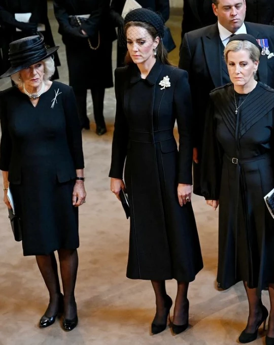 Sigue la seguidilla de eventos relacionada con el funeral de la reina Isabel II y tanto Kate Middleton como Meghan Markle llamaron la atención con sus looks de luto. Las dos llevaron abrigos de largo midi y sumaron elegancia a sus total looks black, además coincidieron con los stilettos y los fascinators con red sobre el rostro. Sin embargo, tanto una como la otra tuvieron un gesto especial para con la reina: sumaron a sus outfit accesorios que ella les había regalado.