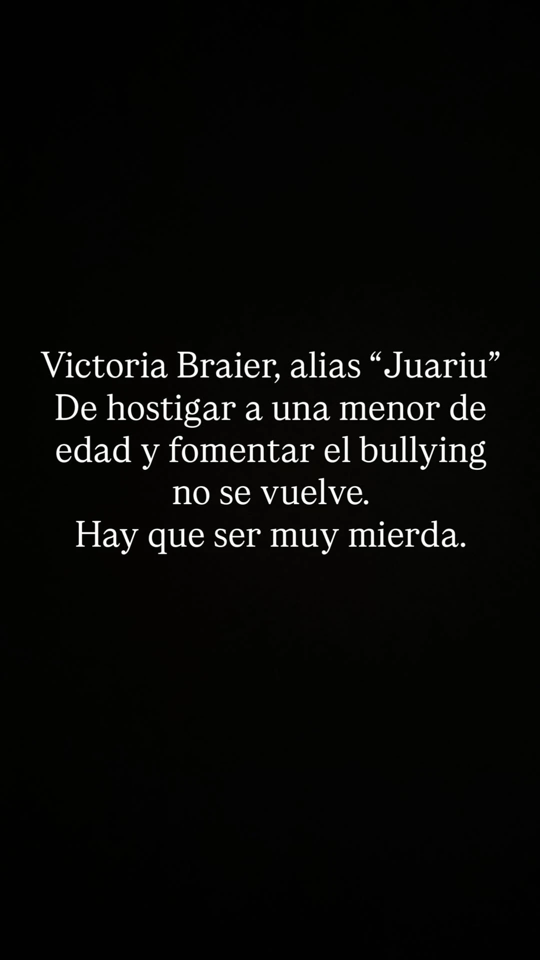 Esto provocó la furia de Suárez quien lanzó su descargo por medio de las redes y explicó el motivo de su enojo. "De hostigar a una menor de edad y fomentar el bullying no se vuelve. Hay que ser muy ***", expresó vía stories de Instagram. Breve y contundente, la ex Teen Angel dejó en claro que no le agradó para nada que se filtraran estos datos.
