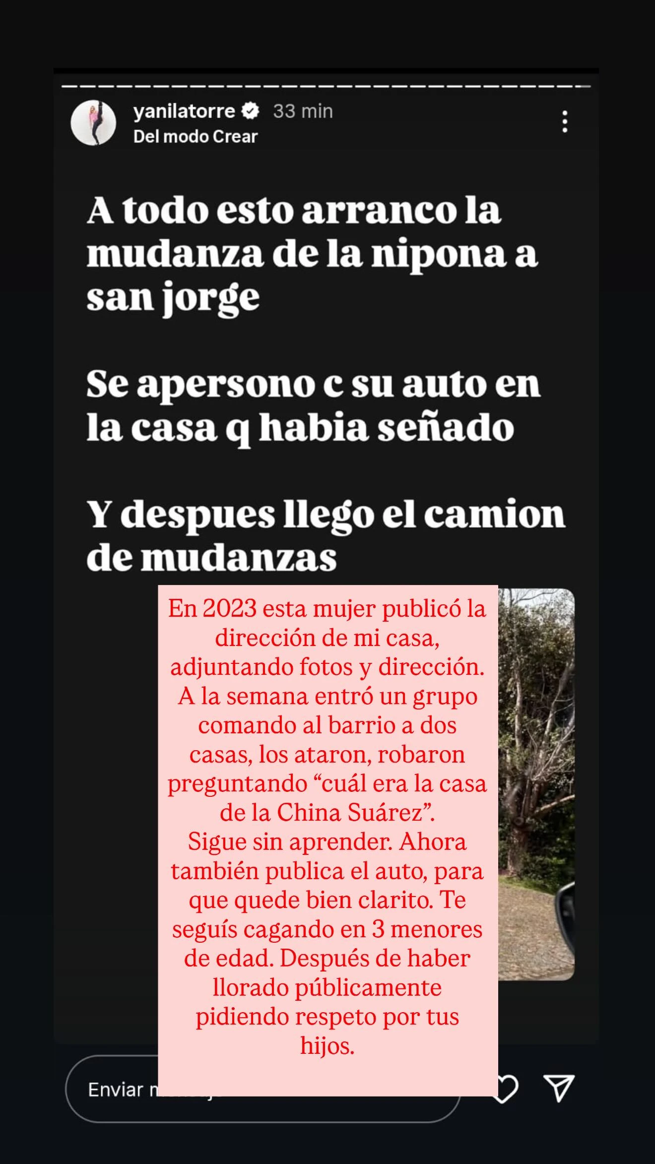 "En 2023 esta mujer publicó la dirección de mi casa, adjuntando fotos y dirección. A la semana entró un grupo comando al barrio a dos casas, los ataron, robaron preguntando ´cuál era la casa de la China Suárez´", reveló la actriz.