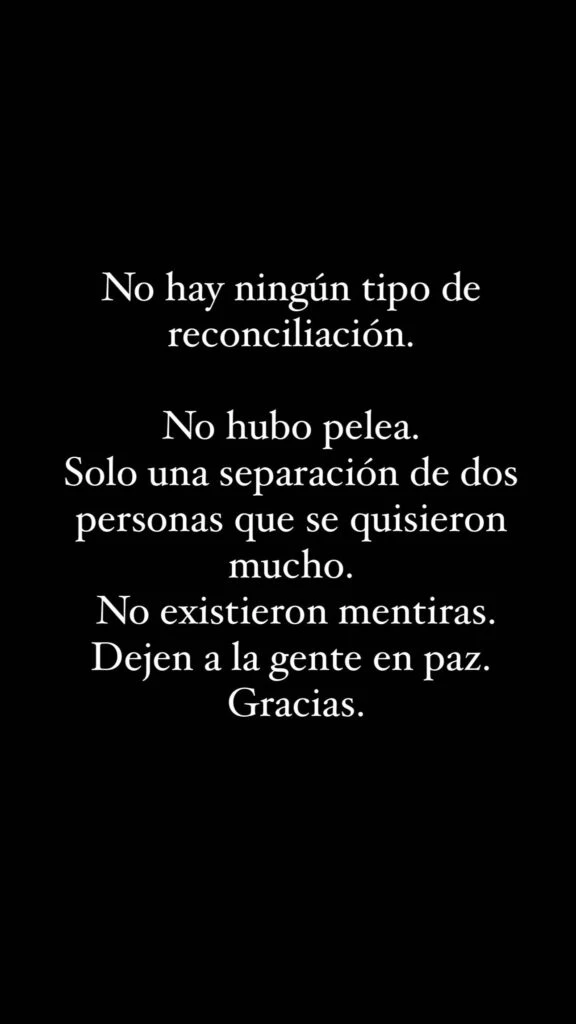 Sin embargo, mientras los días iban pasando, ésta teoría parece desdibujarse. Si bien la ex Teen Angel borró el posteo original donde aseguraba que estaba separada, otra declaración dejaría las cosas más en claro. "No hay ningún tipo de reconciliación. No hubo pelea, sólo separación de dos personas que se quisieron mucho", abrió su mensaje.