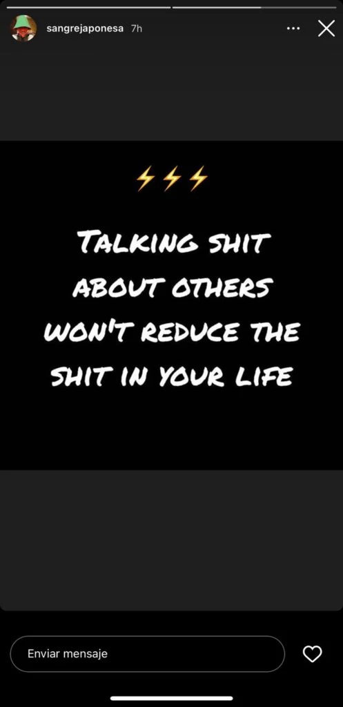 La ex mujer de Benjamín Vicuña fue contundente con un mensaje que publicó en sus historias de Instagram: "Talking shit about others won't reduce the shit in your life", fue la frase en inglés que eligió y que significa “hablar mierda de otros no va a reducir la mierda que hay en tu vida”.