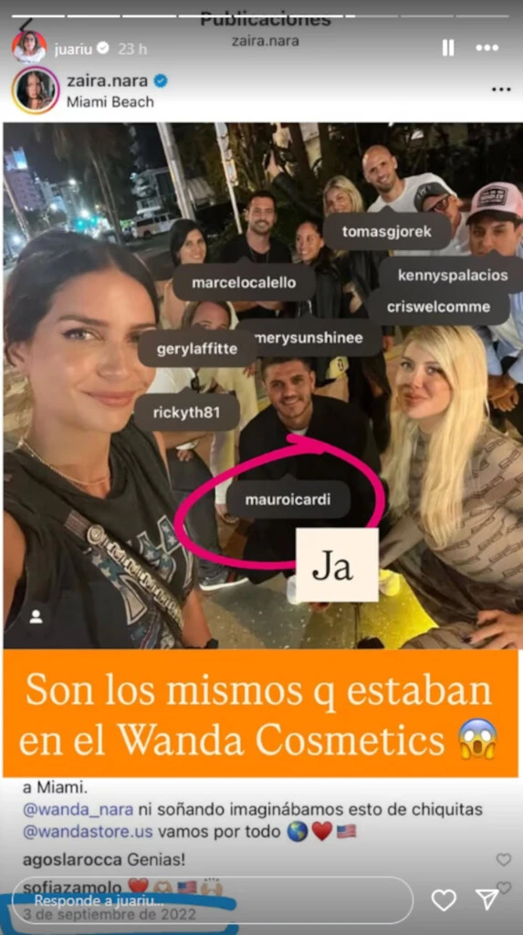 Todo comenzó cuando la actriz compartió una foto desde un estadio de fútbol, acompañada por un grupo de personas. Juariu, experta en detectar detalles ocultos en redes, notó algo llamativo: los acompañantes de la China eran parte del staff que en 2022 trabajaba junto a Wanda en Wanda Cosmetics, la marca de productos de belleza de la empresaria.