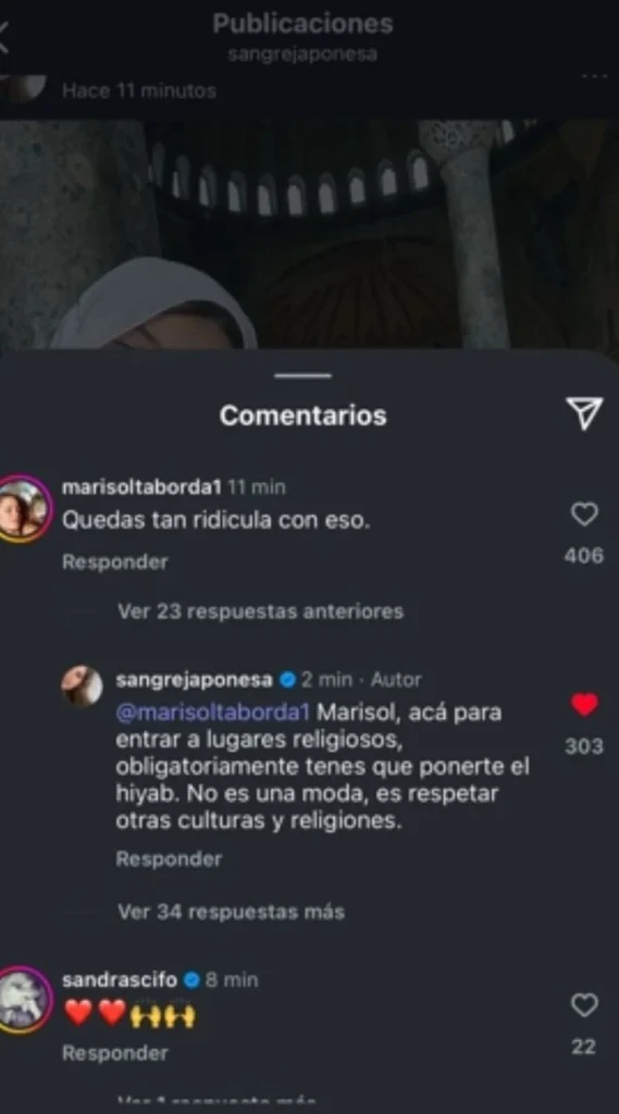 Una de las críticas más duras provino de una usuaria que calificó de “ridícula” a la actriz por usar el velo. Fiel a su estilo frontal, la China no dudó en responder con firmeza. En respuesta al comentario, contestó: “Acá, para entrar a lugares religiosos, obligatoriamente tenés que ponerte el hijab. No es una moda, es respetar otras culturas y religiones”.