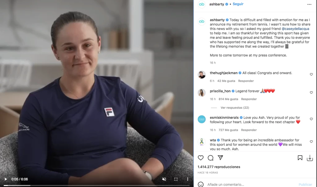 Barty dio la noticia de su retiro semanas después de convertirse en la primera ganadora local del Abierto de Australia. En un mensaje de video en el que se ve llorando y acompañada de su amiga y ex compañera de dobles Casey Dellacqua, Barty dijo estar "agradecida" por todo lo que este deporte le ha dado.