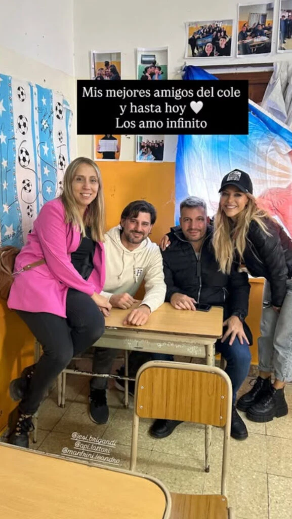 En la imagen, se los ve a los 4 sonriendo en lo que parece ser una de las aulas donde cursaron juntos. Mientras Evangelina se agacha levemente en un extremo de la foto, los 2 hombres aparecen sentados en un banco escolar y la otra mujer, sobre la mesa: un retrato espontáneo, pero cargado de significado.