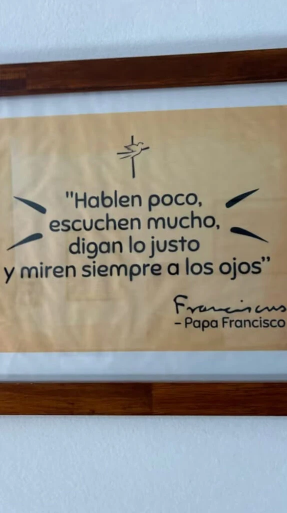 En su recorrido por la institución, Evangelina también compartió una imagen que captó su atención: una frase del Papa Francisco enmarcada en una de las paredes. “Hablen poco, escuchen mucho, digan lo justo y miren siempre a los ojos”, se lee en el mensaje que la modelo quiso resaltar en sus historias, dejando entrever aquello que considera como una gran enseñanza.