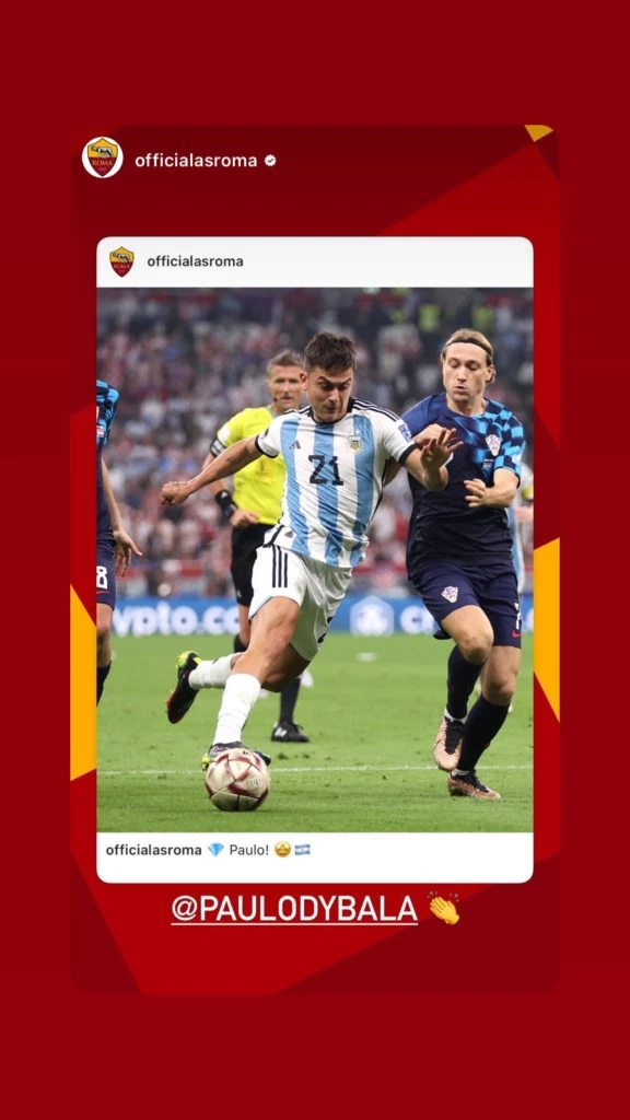 Además, compartió el gesto del club Roma, quien celebró el ingreso de su máxima estrella. Quien no dudó en expresarle su admiración, fue su novia Oriana Sabatini quien mostró los festejos desde el estadio. "Dios mío, no me entra la felicidad en el cuerpo. Te amo Paulo", indicó emocionada, la artista.
