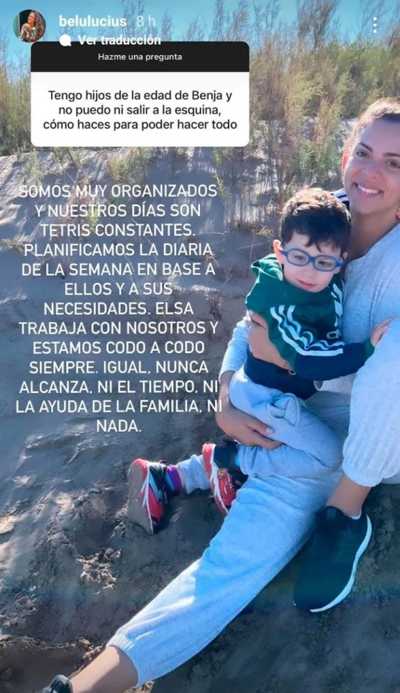 “Tengo hijos de la edad de Benja y no puedo ni salir a la esquina, ¿cómo hacés para poder hacer todo?”, quiso saber una usuaria. A lo que Belu contestó: “Somos muy organizados y nuestros días son tetris constantes. Planificamos la diaria de la semana en base a ellos y a sus necesidades”.