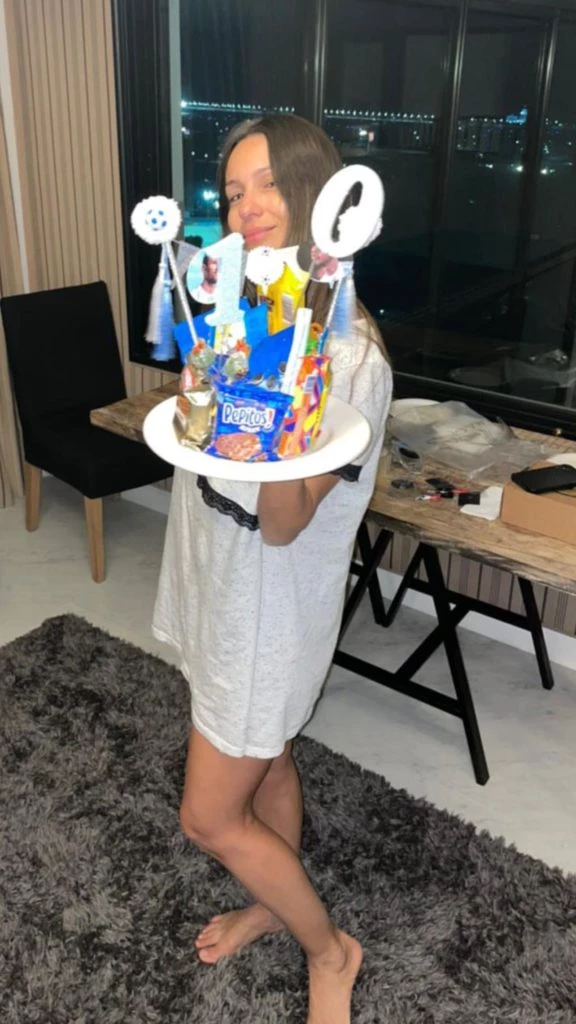 Con la ayuda de una cinta adhesiva, la modelo ató las golosinas de manera circular, armando así la base de esta particular torta. Entre los dulces seleccionados, incluyó alfajores y chocolates de reconocidas marcas, que son los preferidos de Beltrán. Para finalizar, sobre la cima colocó el número "10" y una velita, dándole la apariencia de un tradicional pastel.
