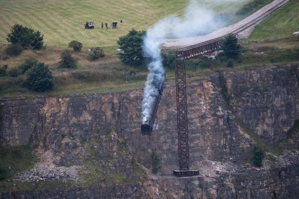 En el clip se observa cómo la réplica de una locomotora 70000 Britannia se descarrila y cae en picada. De acuerdo con el portal de noticias BBC, la escena se grabó en el pueblo de Stoney Middleton (Inglaterra) en donde durante meses se construyó el set de grabación. El tren fue llevado a la locación en un camión de carga para ser colocado en una "pequeña sección de vía especialmente construida" para la película.