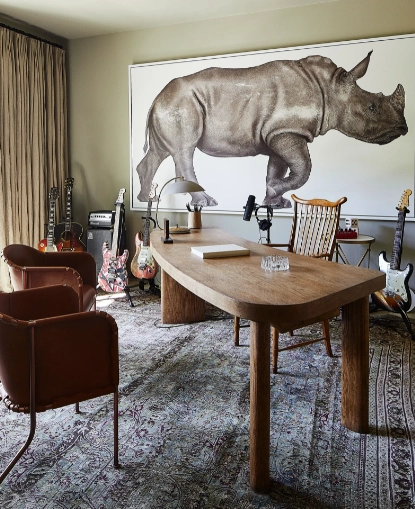 Behati comenta el rol que asume su marido cuando a diseño y renovación se refiere. “Adam usualmente toma las decisiones. Se queda despierto durante la noche mirando muebles y casas. Debería ser diseñador de interiores,” afirma la modelo oriunda de Namibia. En cada una de las habitaciones es posible detectar el gusto exquisito del cantante, desde las sillas de Jacques Adnet en el refugio, hasta el escritorio de Charlotte Perriand desk en la oficina. También la inmensa pintura de Raymond Pettibon que se ubicó sobre la pared cabecera del dormitorio principal.