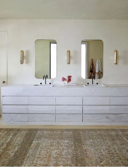 Las luminarias son de Joseph Dirand, junto con una carpeta antigua estilo Dorokhsh de Woven se unen al tocador customizado de Calacatta, con griferías de Vola en el baño principal.