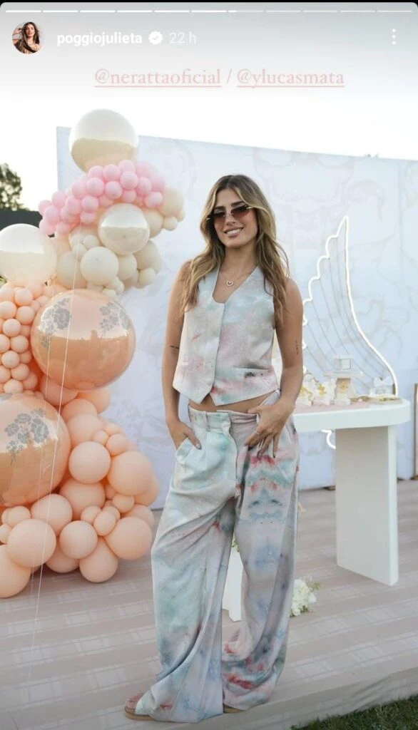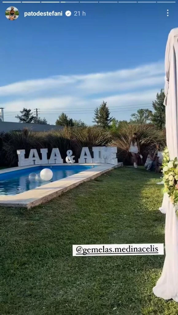 Si bien los padres de las gemelas no subieron imágenes a las redes sociales, sí lo hicieron algunos de los presentes. Entre las postales, se podía ver parte de la decoración que incluyó letras gigantes y lumínicas con los nombres de las niñas, globos rosa pastel, una torta de dos pisos con una cruz, unas alas blancas grandes y arreglos florales.