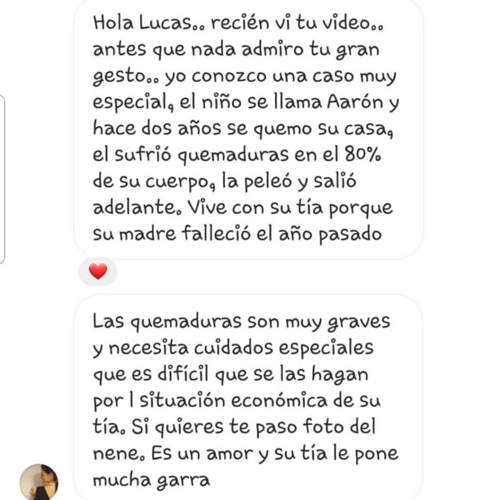 Franco se entusiasmó mucho con la idea y Lukas subió un video a Instagram preguntando si alguien sabía de algún caso de alguien que necesite el dinero. “Ahí fue que me llegó el caso de Aaron que ya es muy conocido".