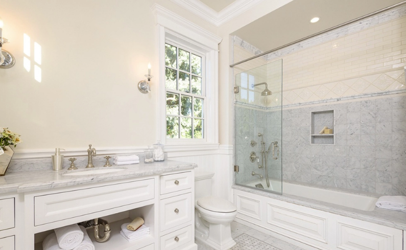 Uno de los cuartos de baño tiene paneles de yeso con molduras en los muros. Además, cuenta con varios muebles para el correcto almacenamiento que requiere el lugar. Cuenta con ventanas por la que ingresa un gran caudal de luz natural, razón por las que la actriz aprovechó para sumar plantas a la decoración.