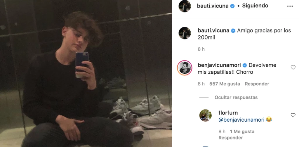"Devolveme mis zapatillas!! Chorro", le escribió Benjamín. El actor recibió varios likes y otros comentarios de padres y madres de adolescentes: "Acostumbrate, esto recién empieza", fueron para de los consejos.
