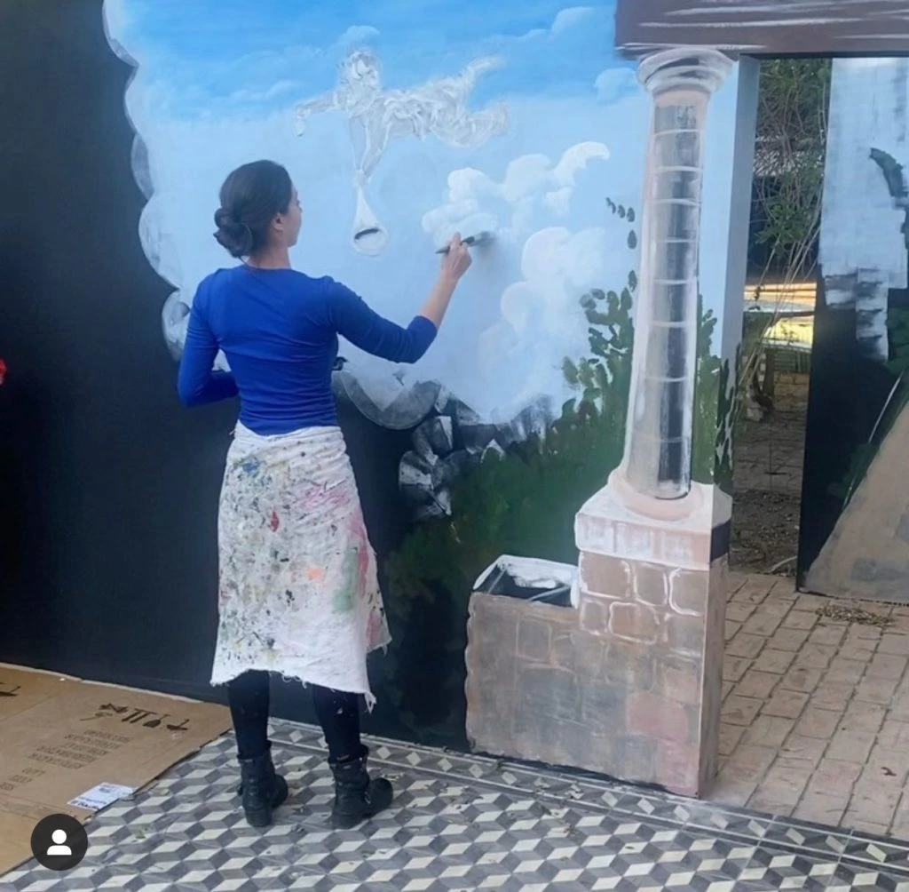 Es así que lució los detalles finales de un imponente mural la artista Noelia Fernández en el exterior de la casa en donde ilustro algunas paredes con el objetivo de integrarlas al entorno.