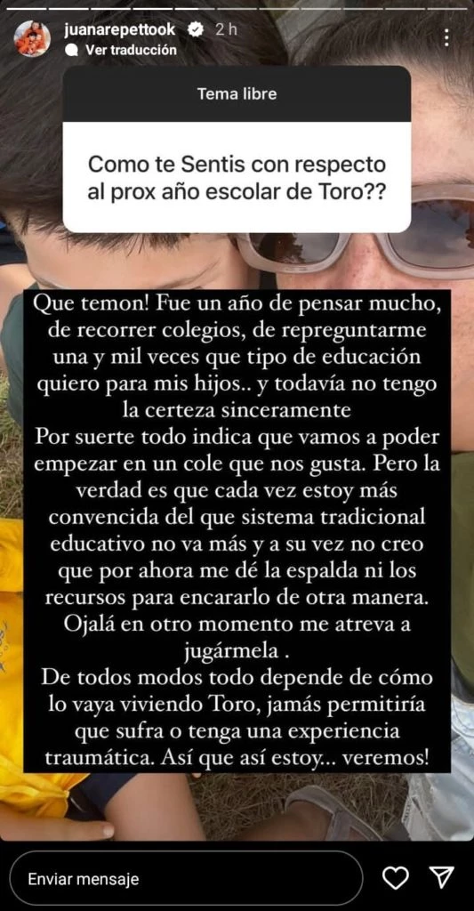 A través de las redes sociales, Juana fue consultada sobre qué pasará el próximo año con Toribio, su hijo mayor, quien ya tiene 6 años. "Qué temón, fue un año de pensar mucho, de recorrer colegios, de repreguntarme una y mil veces qué tipo de educación quiero para mis hijos y todavía no tengo la certeza sinceramente. Por suerte, todo indica que vamos a poder empezar en un cole que nos gusta", comenzó a explicar.