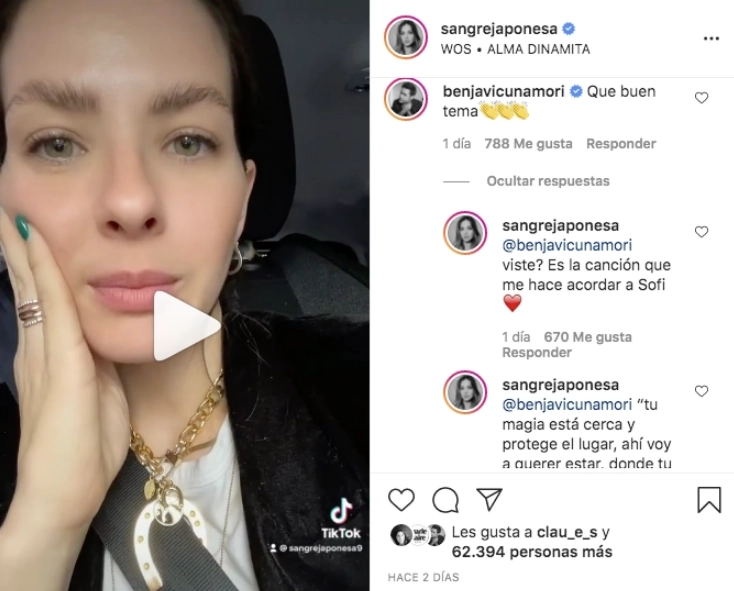 Inmediatamente, Vicuña comentó "Qué buen tema" y agregó emojis de aplausos. La China le contestó: "Viste, es la canción que me hace acordar a Sofi (Sarkany)" y añadió un emoji de corazón. Y luego volvió a arrobar a su pareja y agregó: “tu magia está cerca y protege el lugar, ahí voy a querer estar, donde tu risa me saque a bailar”.