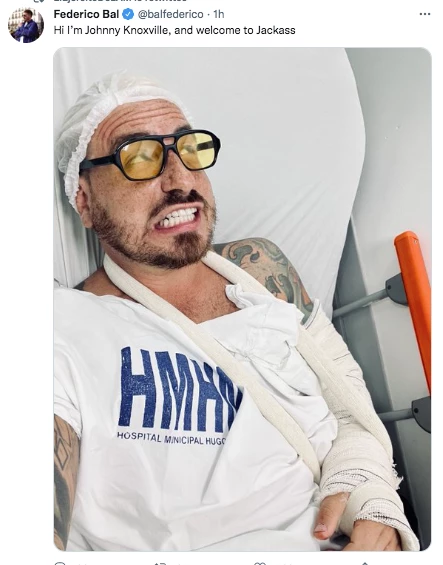 “Hi I’m Johnny Knoxville, and welcome to Jackass (Hola, soy Johnny Knoxville, bienvenidos a Jackass)”, escribió en su cuenta de Twitter al hacer referencia con humor a un programa que tenía como centro mostrar una serie de acciones riesgosas llenas de adrenalina.