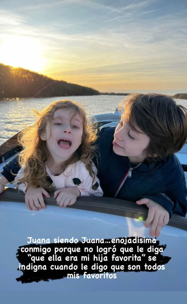 “Juana siendo Juana, enojadísima conmigo porque no logró que le diga que ella “era mi hija favorita”. Se indigna cuando le digo que son todos mis favoritos”, dijo en tono jocoso al publicar una historia en donde se ve a la pequeña junto a su hermanito.