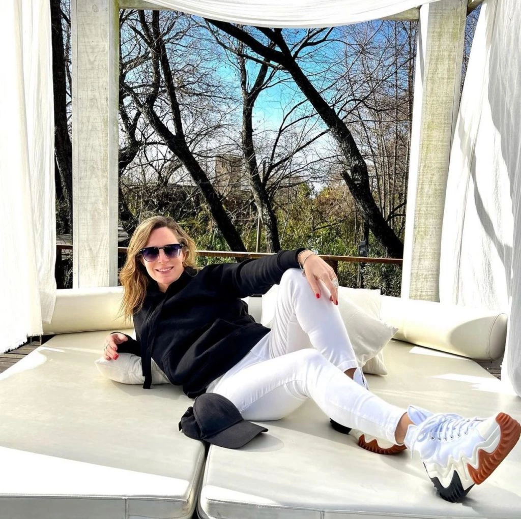 En las fotos se la puede ver distendida en un camastro con un look súper casual compuesto por un pantalón blanco, zapatillas al tono y un buzo negro.