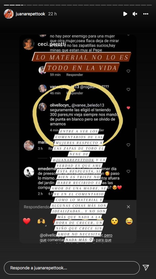 Atenta a las respuestas de sus seguidores, Juana se indignó y destacó un comentario que recibió por parte de una seguidora que la defendía entre tantas críticas. "Seguramente las eligió él teniendo 300 pares (de zapatillas). Mi vieja siempre nos mandó de punta en blanco, pero se olvidó de amarnos", escribió la usuaria.