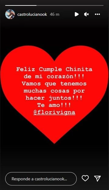 Con un corazón rojo, el integrante de "El primero de nosotros" le escribió vía stories. "Feliz cumple Chinita de mi corazón!!! Vamos que tenemos muchas cosas por hacer juntos!!! Te amo!!!", expresó Castro etiquetando a Vigna, a lo que la artista no tardó en responderle. "Hacés mi vida más linda cada vez más amor", publicó.
