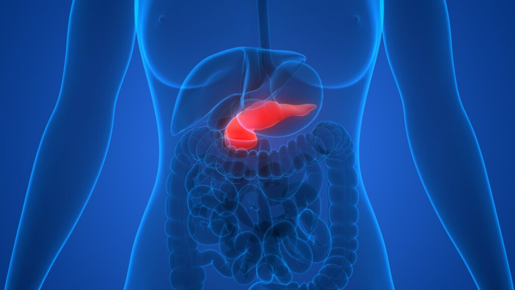 El páncreas es un órgano grande que se ubica en la parte superior del abdomen detrás del estómago.