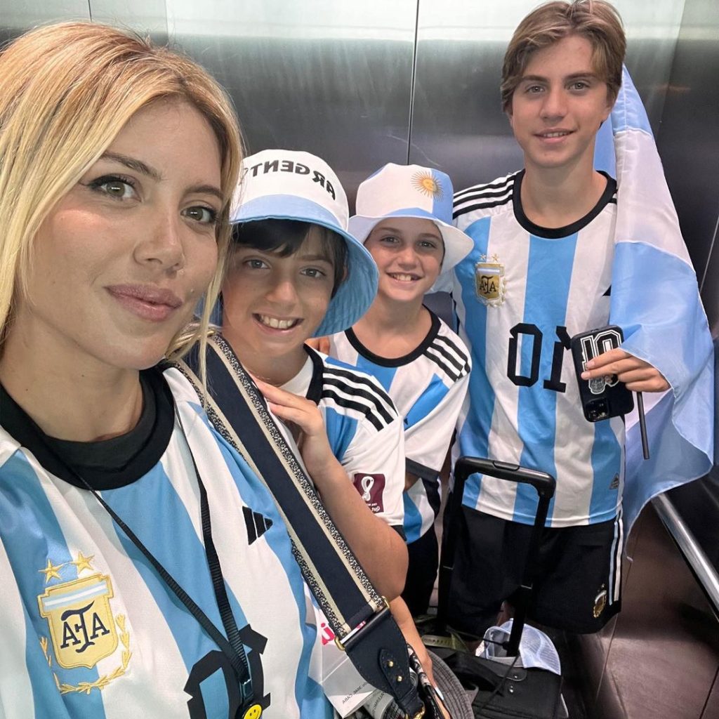 Por medio de sus redes, Wanda también mostró los looks "de cancha" que usaron sus hijos, para llegar al hotel en Doha: desde camisetas argentinas, hasta banderas, gorritos, pilusos y accesorios para el celular, con los colores de la Albiceleste. Así, los hijos de Nara y López se mostraron plenamente felices de ser parte de este momento histórico para la Argentina.
