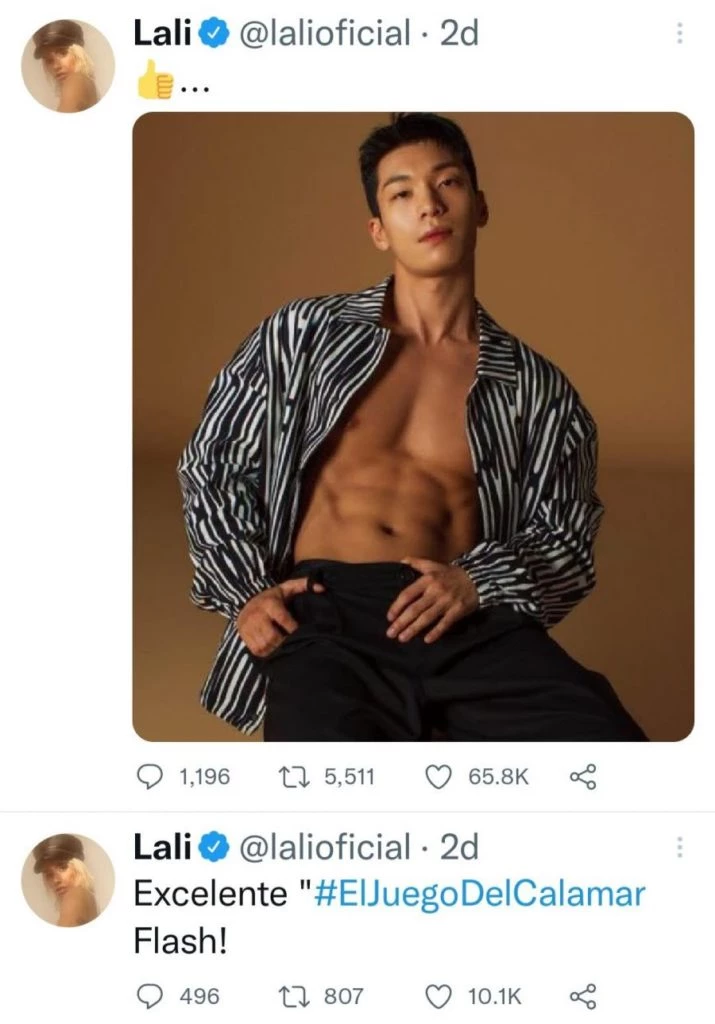Este actor de 30 años no sólo logró cautivar al público con su papel, sino que también logró la reacción de Lali Espósito quien dio su aprobación al artista con una foto. La ex jurado de La Voz compartió una foto del joven coreano en Twitter junto a un emoji de "pulgar para arriba" y en la que el actor aparece con el torso desnudo.