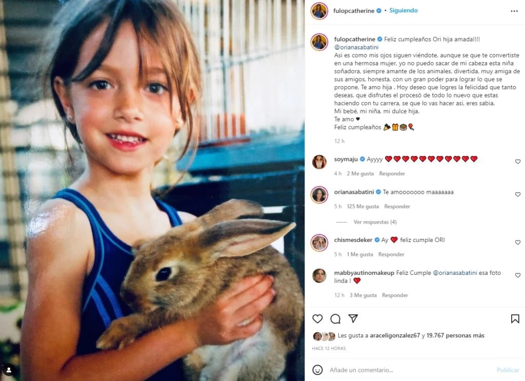 La exparticipante de Masterchef Celebrity logró emocionar a todos con su posteo dedicado a su primogénita. "Feliz cumpleaños Ori hija amada. Así es como mis ojos siguen viéndote, aunque sé que te convertiste en una hermosa mujer, yo no puedo sacar de mi cabeza esta niña soñadora, siempre amante de los animales, divertida, muy amiga de sus amigos, honesta, con un gran poder para lograr lo que se propone", escribió conmovida junto a una foto retro de Oriana.