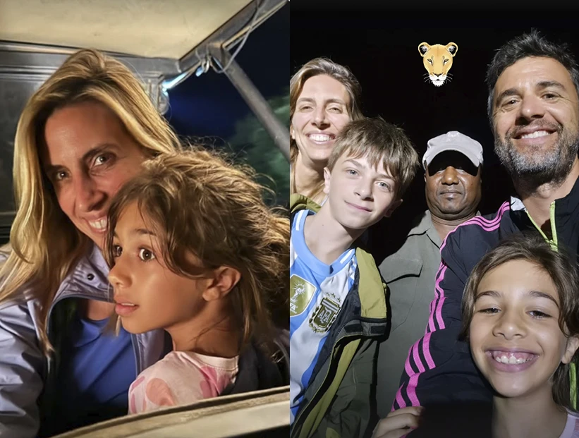 La periodista, que viajó junto a su marido, Martín Guglielmone, y sus hijos Jacinta (9) y Vito (12), mostró momentos de un safari nocturno donde pudieron divisar animales como leones y leopardos.