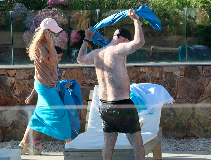 En la playa, la pareja se mantuvo resguardada del viento detrás de la sombrilla en el balneario de Terrazas de Manantiales. Rodríguez Larreta fue hasta el mar pero regresó sin meterse en el agua.