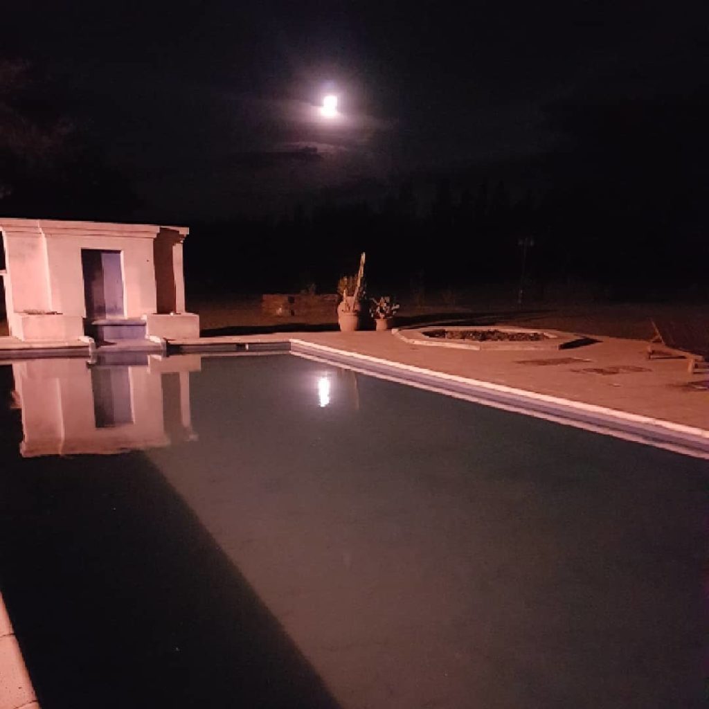 La pileta es sin duda el lugar preferido de la casa. Tanto de día como de noche... La pileta tiene reposeras de madera para disfrutar de día, y también en algunas esquinas, Irina colocó vasijas de barro con plantas.