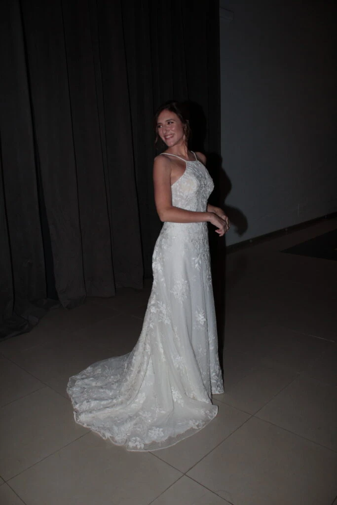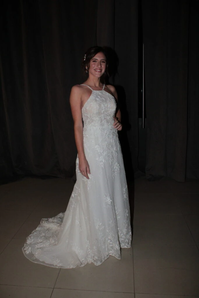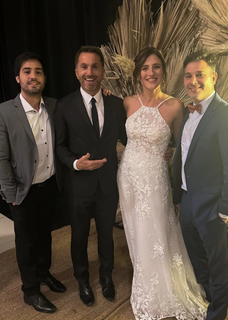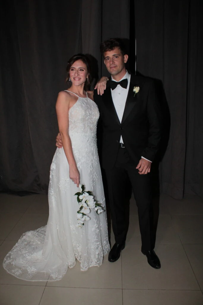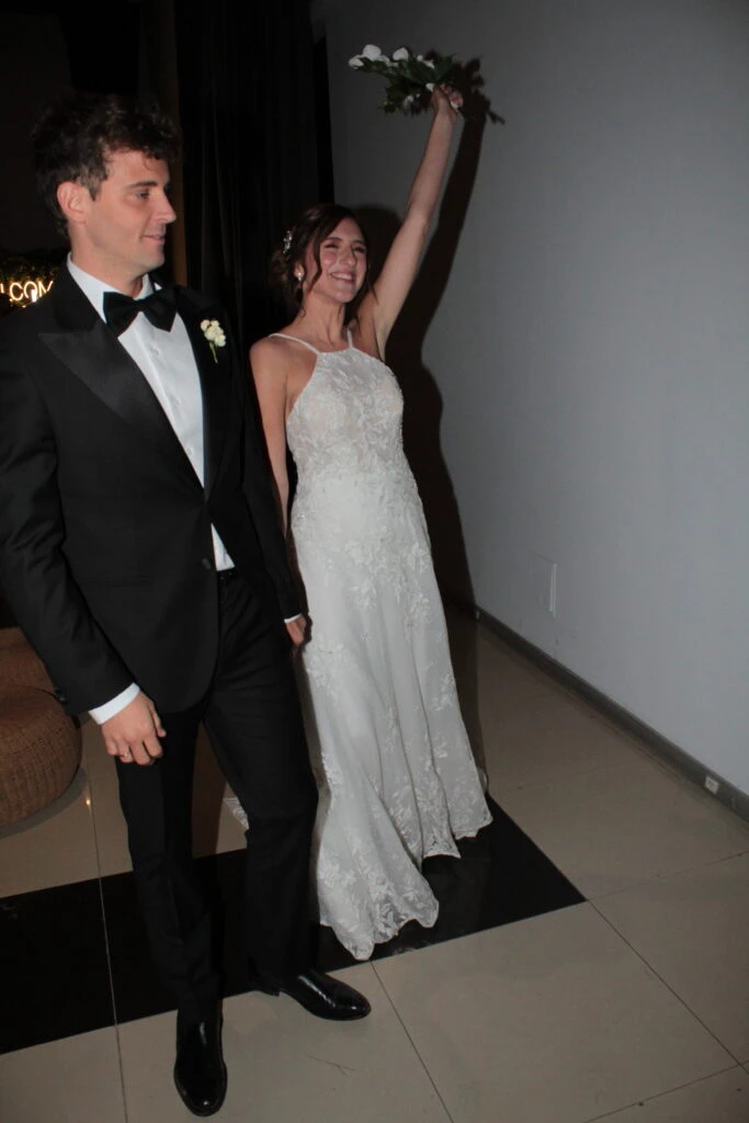 Las primeras imágenes del evento trascendieron gracias al padre que realizó la bendición durante la ceremonia. En ellas, se puede ver a la feliz pareja en el altar, con el protagonismo del vestido de la periodista y su imponente velo.
