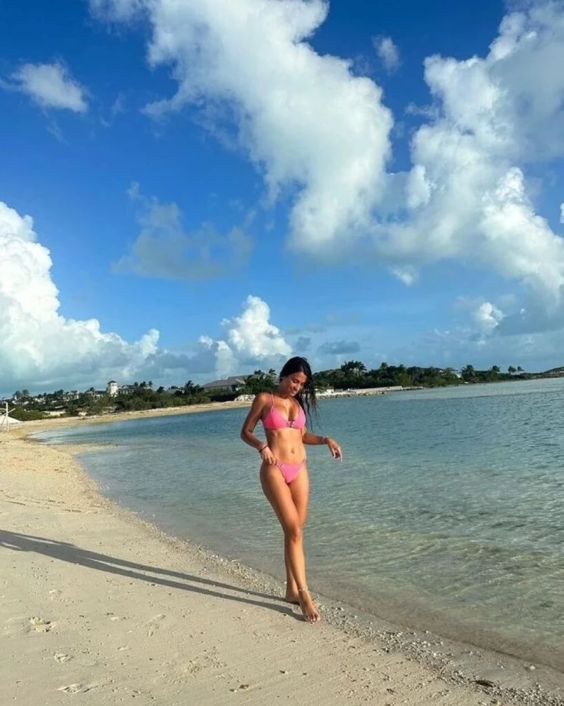 Primero, publicó una foto en su perfil oficial caminando por la playa con una bikini rosa y luego subió a sus historias una postal del futbolista que se encuentra al borde de una pileta también cercana a una playa que acompañó con un emoji de una cara con corazones.