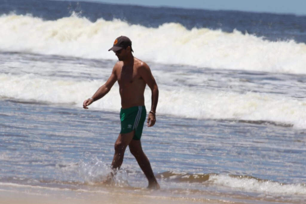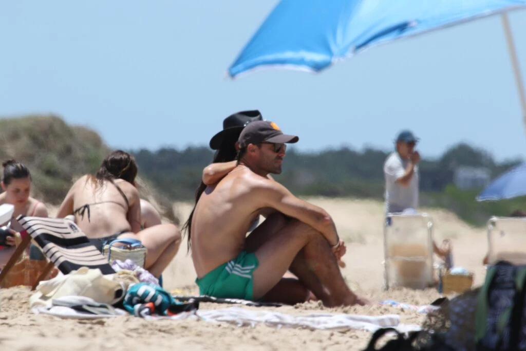 Facundo Pieres, por su parte, llevó un traje de baño de diseño retro, en color verde con detalles en blanco y sumó una gorra trucker para el sol.