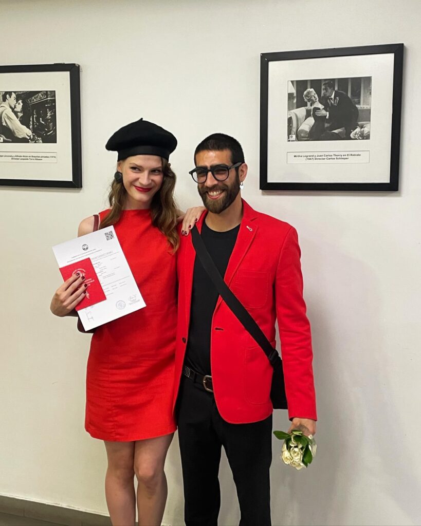 Los novios optaron para la ceremonia de unión civil por looks en rojo y negro. Caro llevó un mini vestido al cuerpo, zapatos negros a lunares blancos y complementó con una boina y aros.