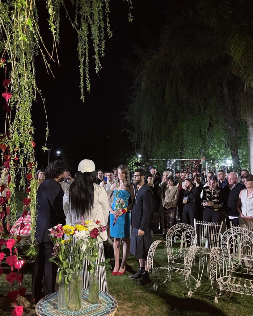 La celebración continuó con una ceremonia al aire libre que se realizó por la noche, donde los novios cambiaron de look: la novia llevó un vestido strapless de largo a la rodilla con zapatos en rojo. El novio, una falda gris con un blazer negro.