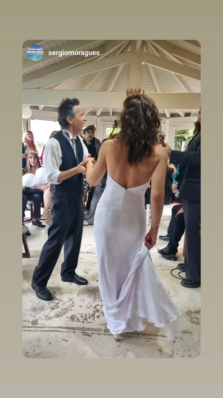 Por un lado, Calamaro lució un chaleco sastrero negro con camisa y corbata gris perlada, pantalones negros y zapatos a juego. Mientras que la novia optó por un vestido con escote corazón y silueta sirena que marcaba bien su figura y zapatos blancos. Además, el diseño contó con un gran velo largo con detalles de bordado que se sacó luego de la ceremonia.