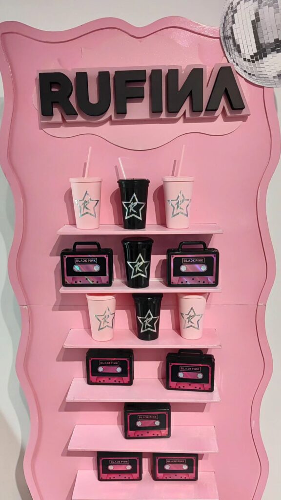 Las invitadas recibieron un vaso con la letra "R" con brillos y una valijita personalizada de la banda coreana. Por supuesto, todo en color rosa y negro, que son los que caracterizan al grupo musical conformado por Jennie, Lisa, Rosé y Jisoo.