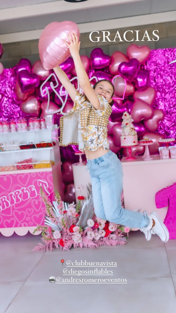 La pequeña -cuyo cumpleaños fue el 23 de agosto- eligió como temática a la "Triple T", ya que es fanática de Tini Stoessel. De esta manera, el salón donde se celebró la fiesta se decoró íntegramente de rosa y fucsia, y la mesa dulce, el candy bar y la torta estuvieron creados con los colores de Tini.