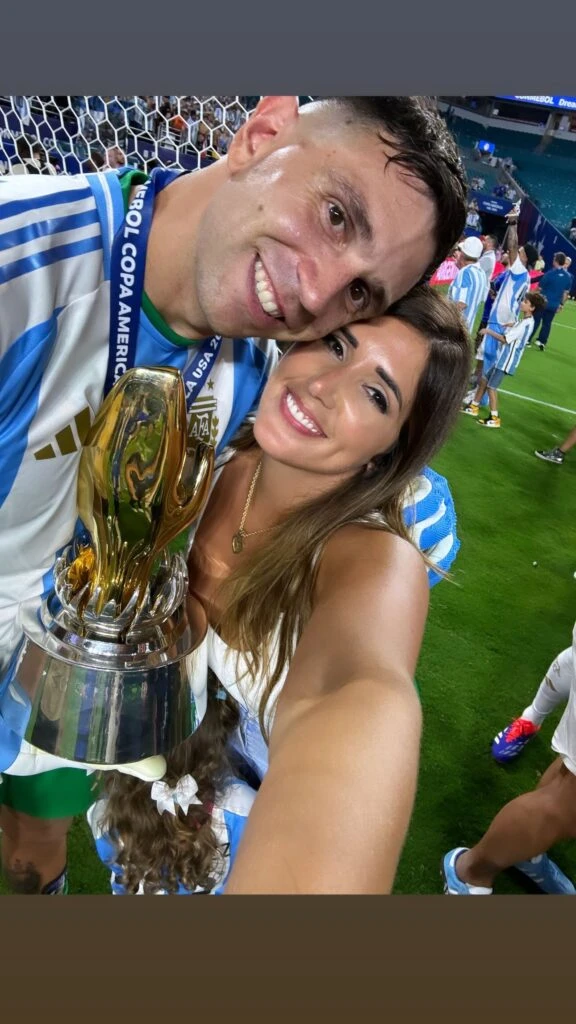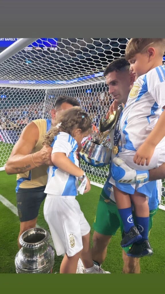 Este domingo, luego de que la Selección Argentina se consagró bicampeón de América, Mandinha Martínez compartió en su cuenta de Instagram diversas fotos y videos del Dibu Martínez festejando junto a sus hijos, Ava y Santino, y también posando con la copa.
