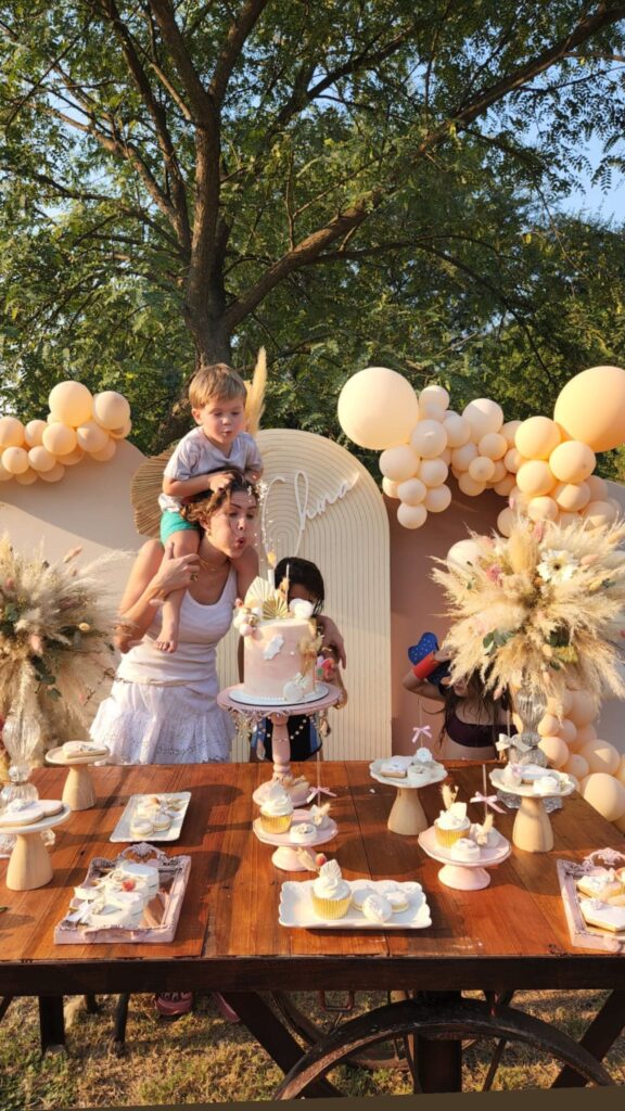 En esta celebración, también hubo torta para la cumpleañera y una exquisita mesa dulce, conformada por mutffits, alfajores de maicena y masitas secas. En cuanto a la decoración, se contó con una estética vintage, con colores pasteles donde predominaron distintos tonos de beige, elegidos especialmente por la actriz.